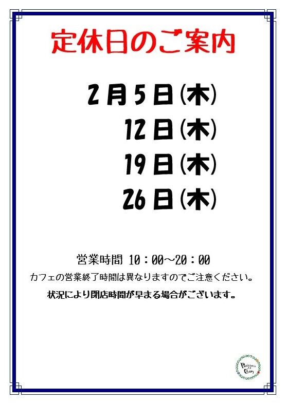 2月定休日のご案内です。