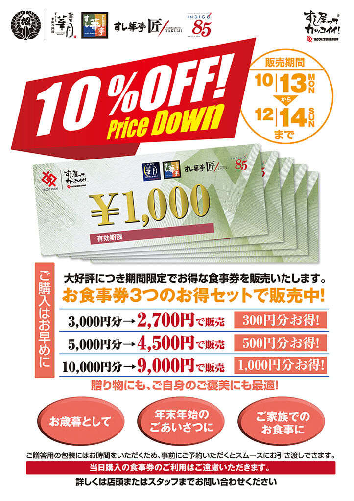 お店でのお会計が10%割引になる食事券セット販売中です!