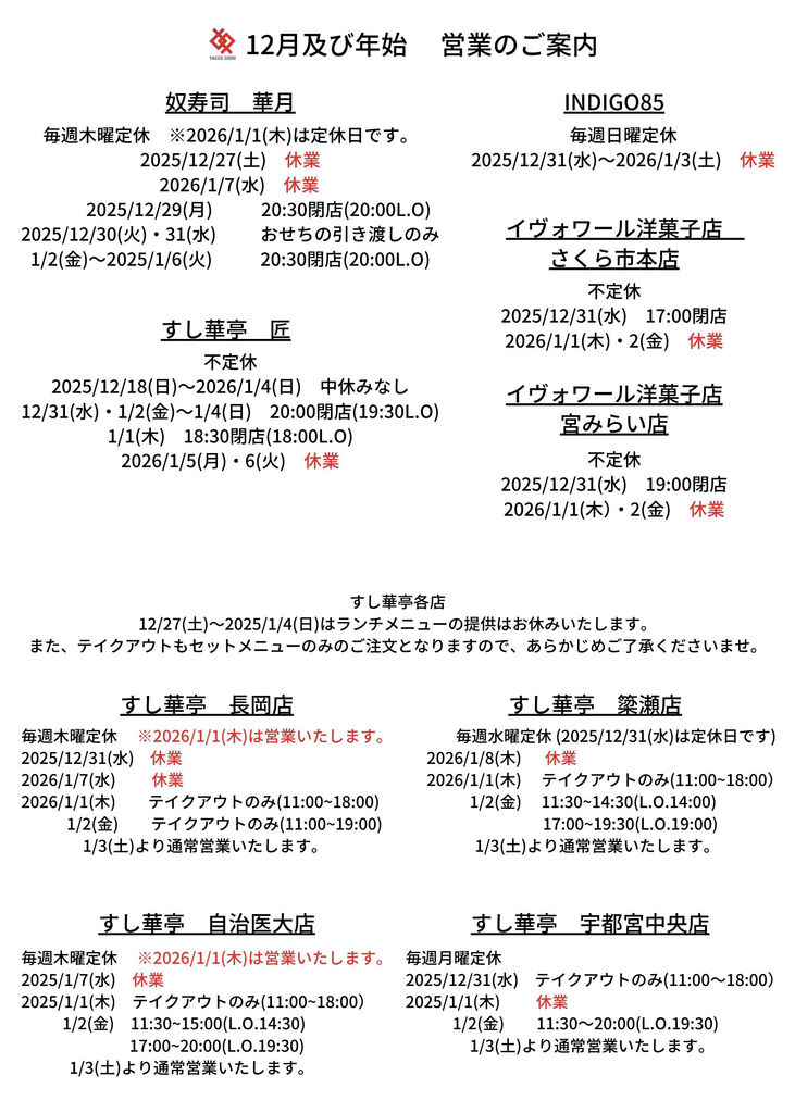 12月及び年末年始の奴寿司グループの営業カレンダーになります。