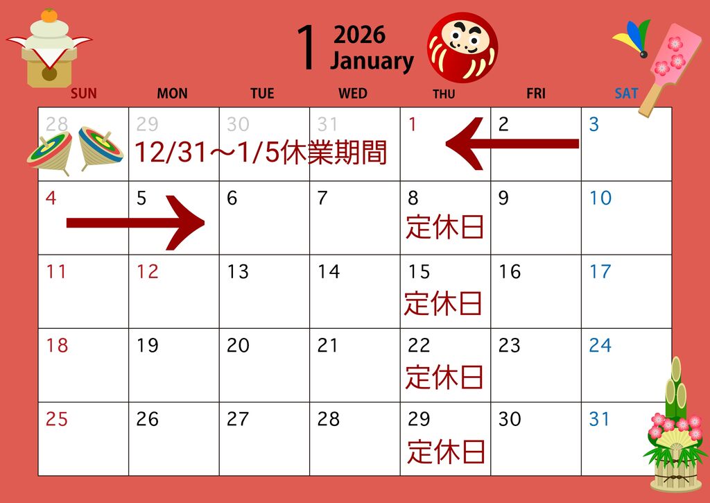 お知らせ 1月定休日のお知らせ(26/01/15)