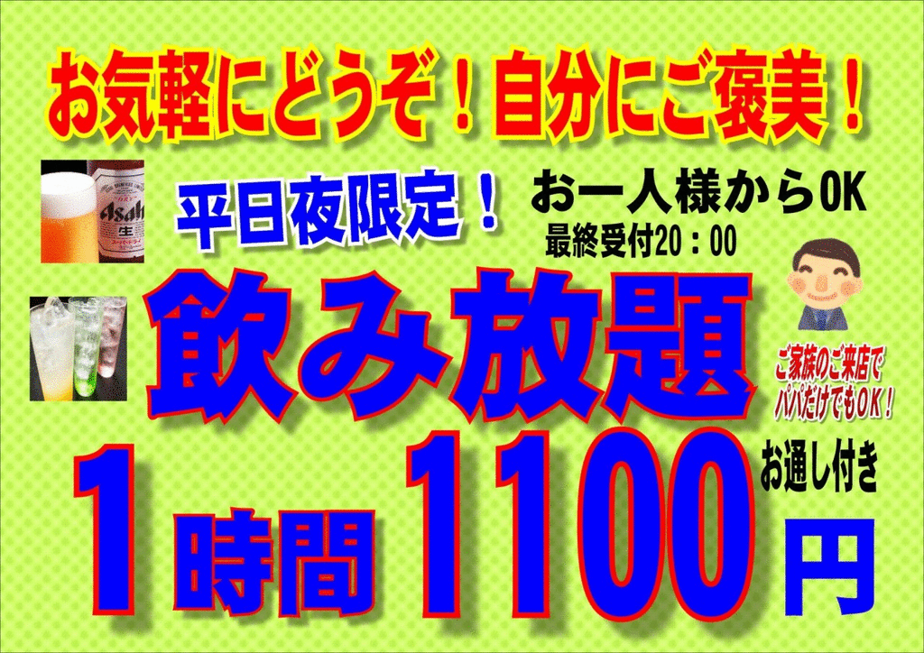 飲み会・宴会 飲み放題1時間1,100円(平日夜限定)やってます。(25/02/04)