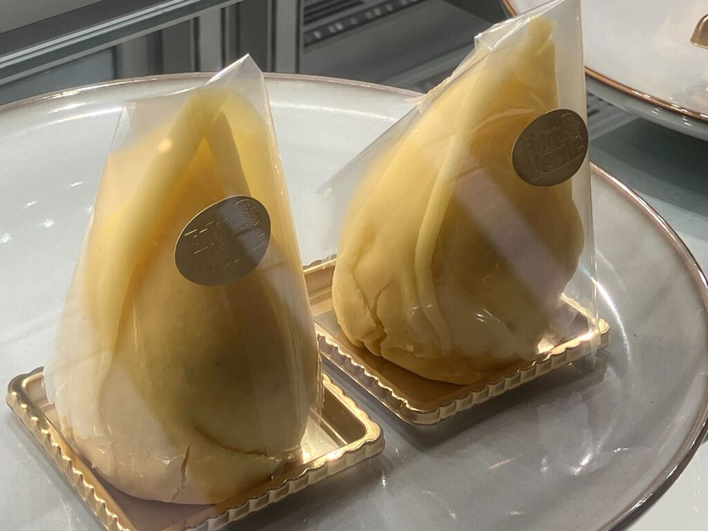 黄栗のペーストを薄くのばし、ロールケーキ、カスタード、生クリームの土台にはりつけた珍しいモンブランです。