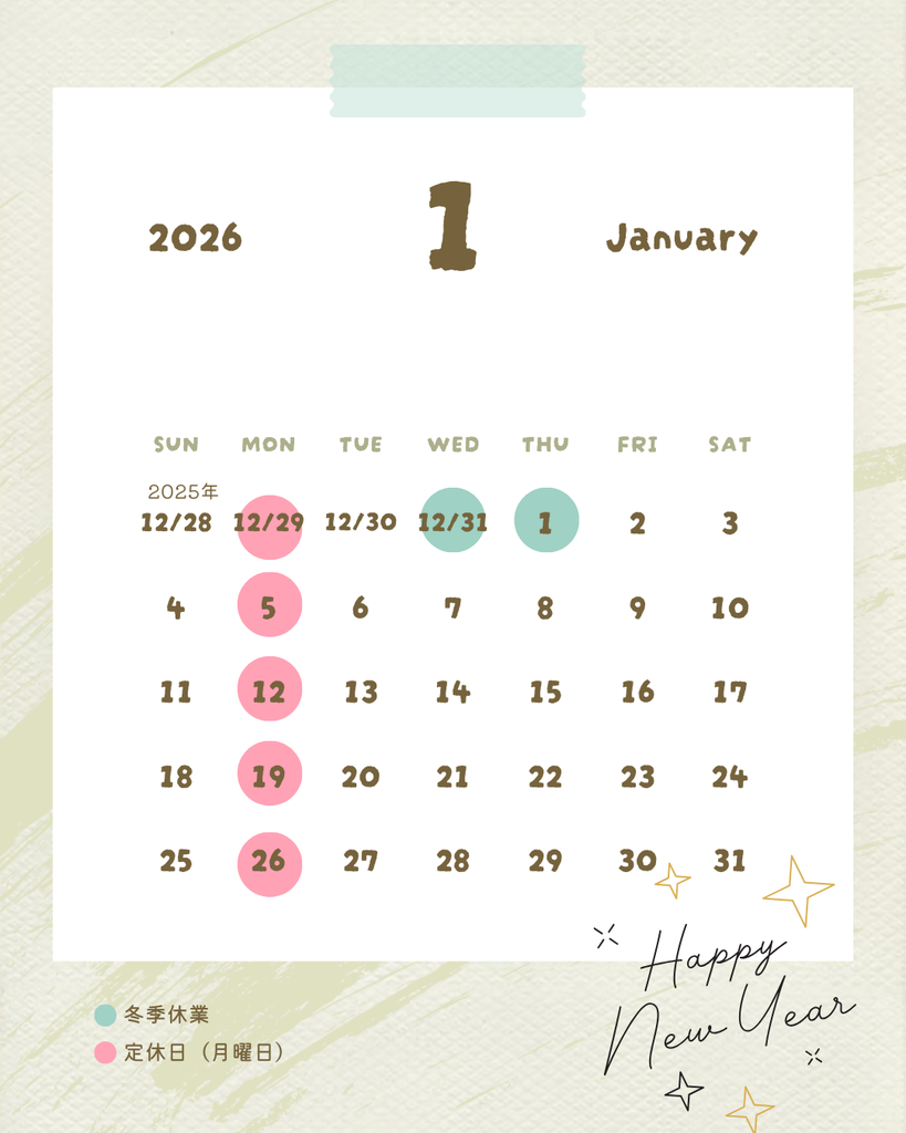 お知らせ 年末年始と2026年1月定休日のお知らせ(25/12/27)